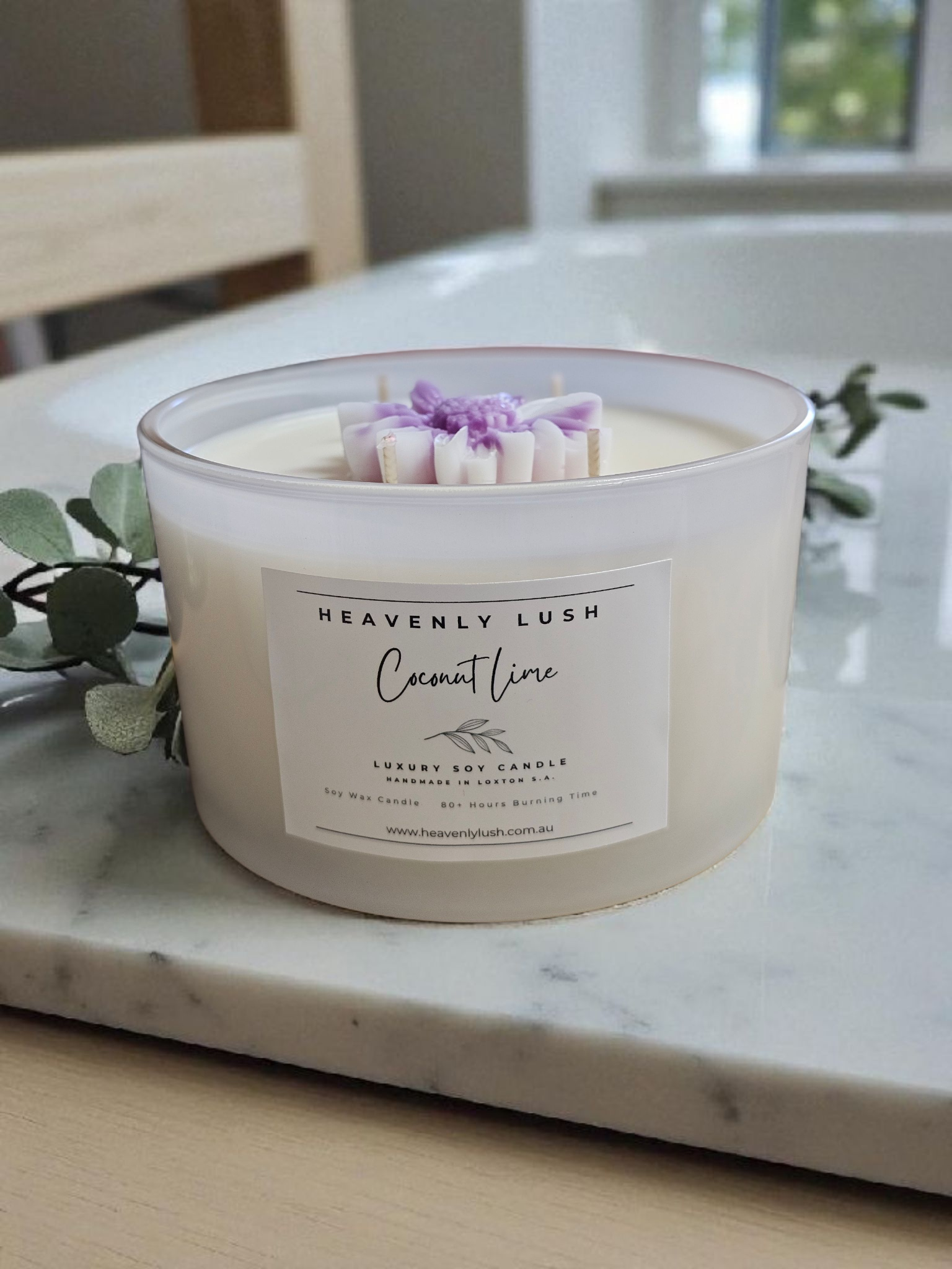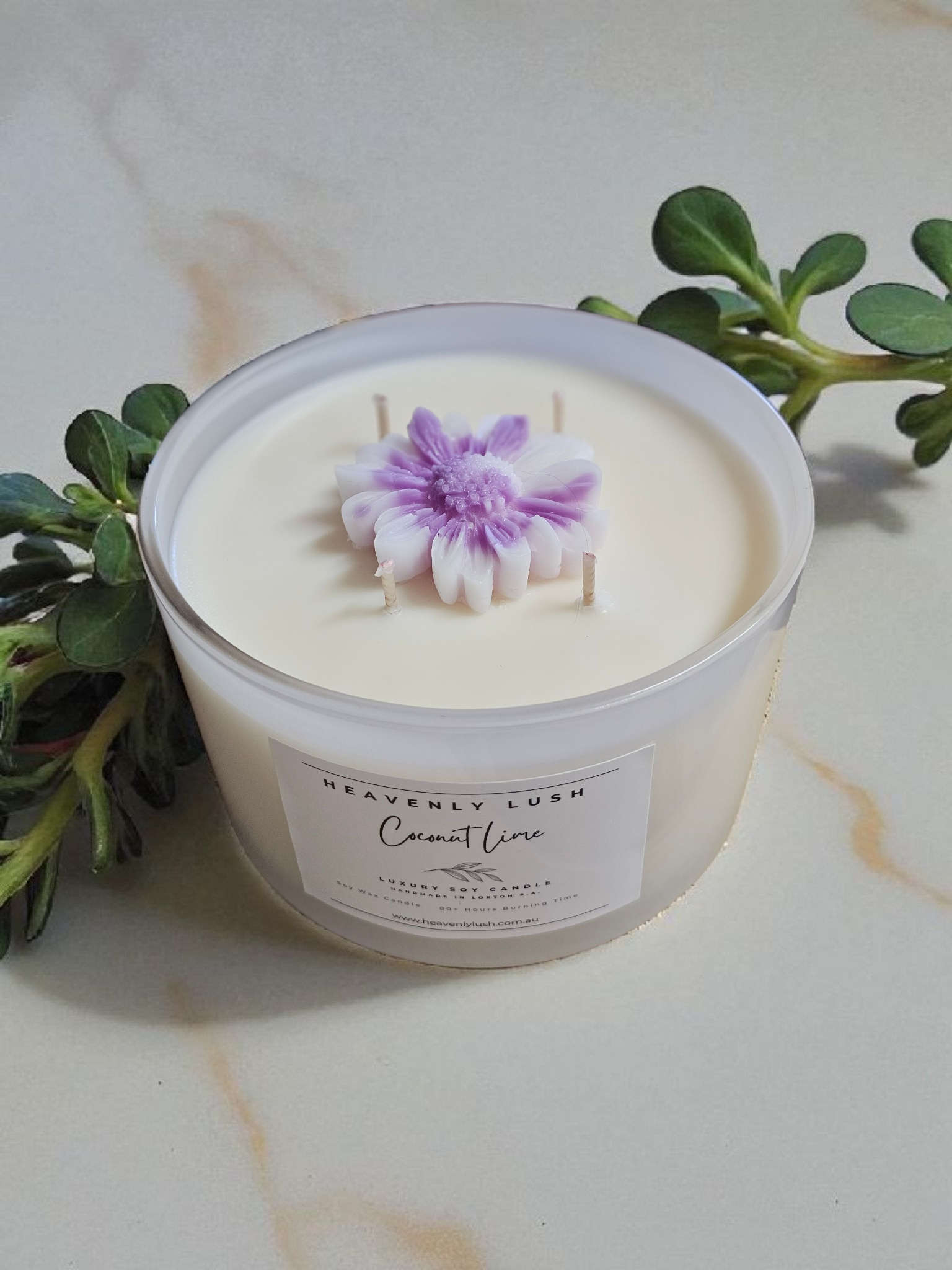 Carefully Handpoured using environmentally friendly Soy Wax and 4 wicks, leaving a smooth creamy top with an elegant look when lit. Scented in your chosen scent, and finished with a pretty flower in the centre, these candles have a long burn time of 80+ hours.